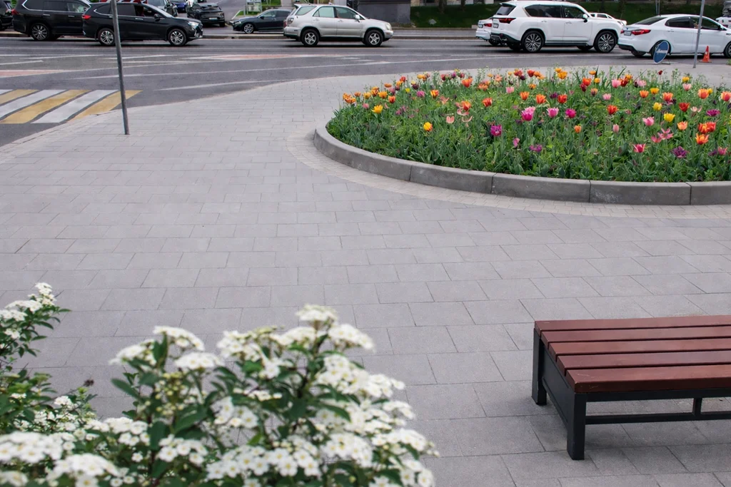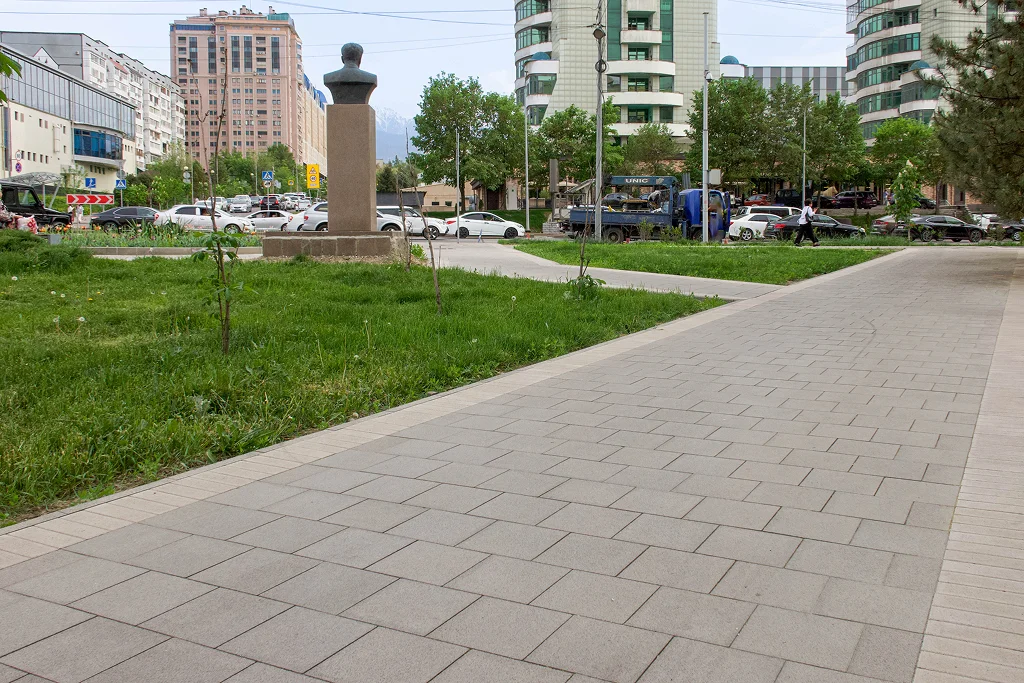 Небольшой алматинский сквер, вдоль проспекта Аль-Фараби, обрёл современный и аккуратный облик. Радиусные бордюры позволили мягко оформить клумбу и сохранить плавность линий пространства. Дорожки вымощены в классическом рисунке с применением форматов 30×30 и 30×15, что придало скверу сдержанный, благородный характер и сделало его комфортным для прогулок.