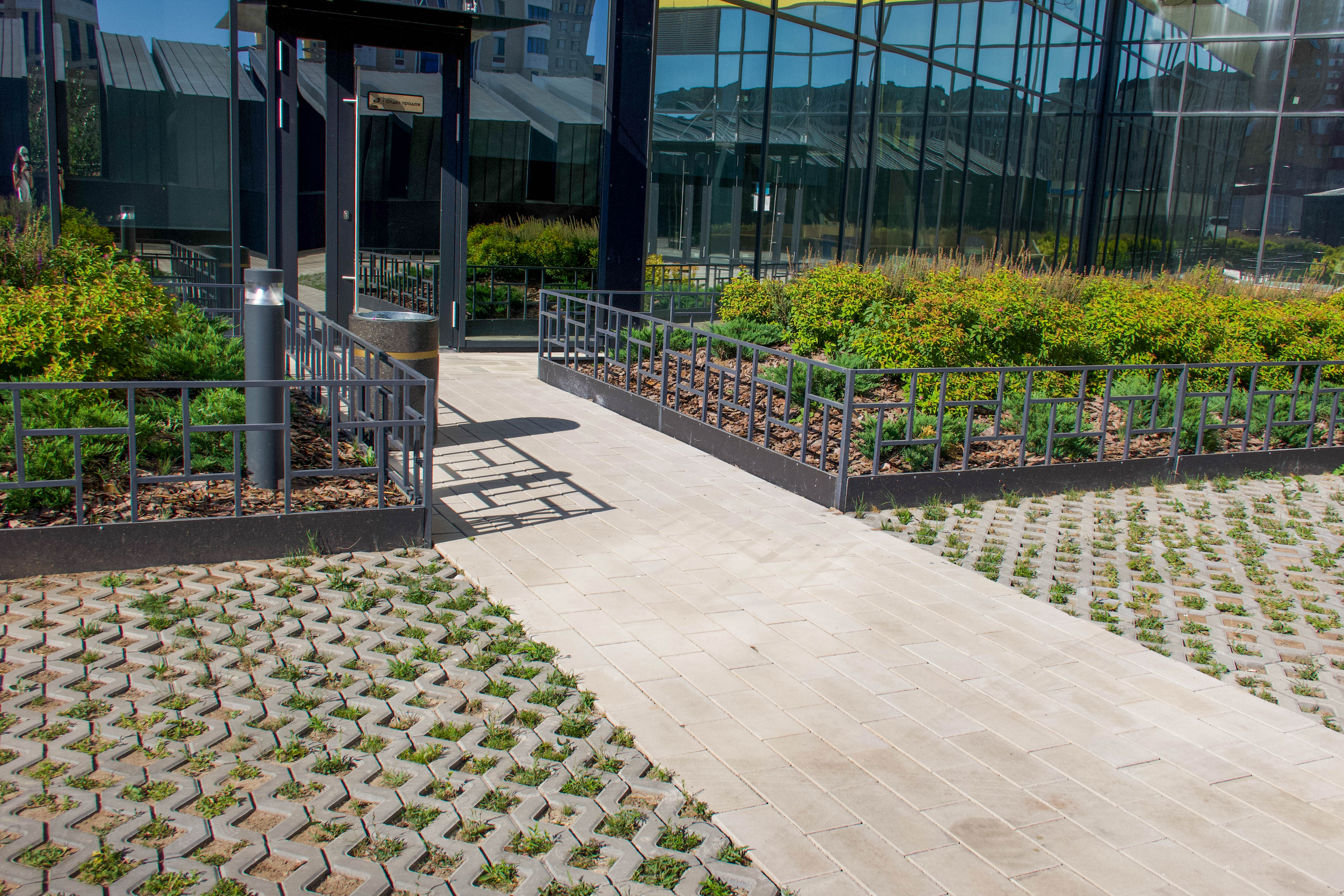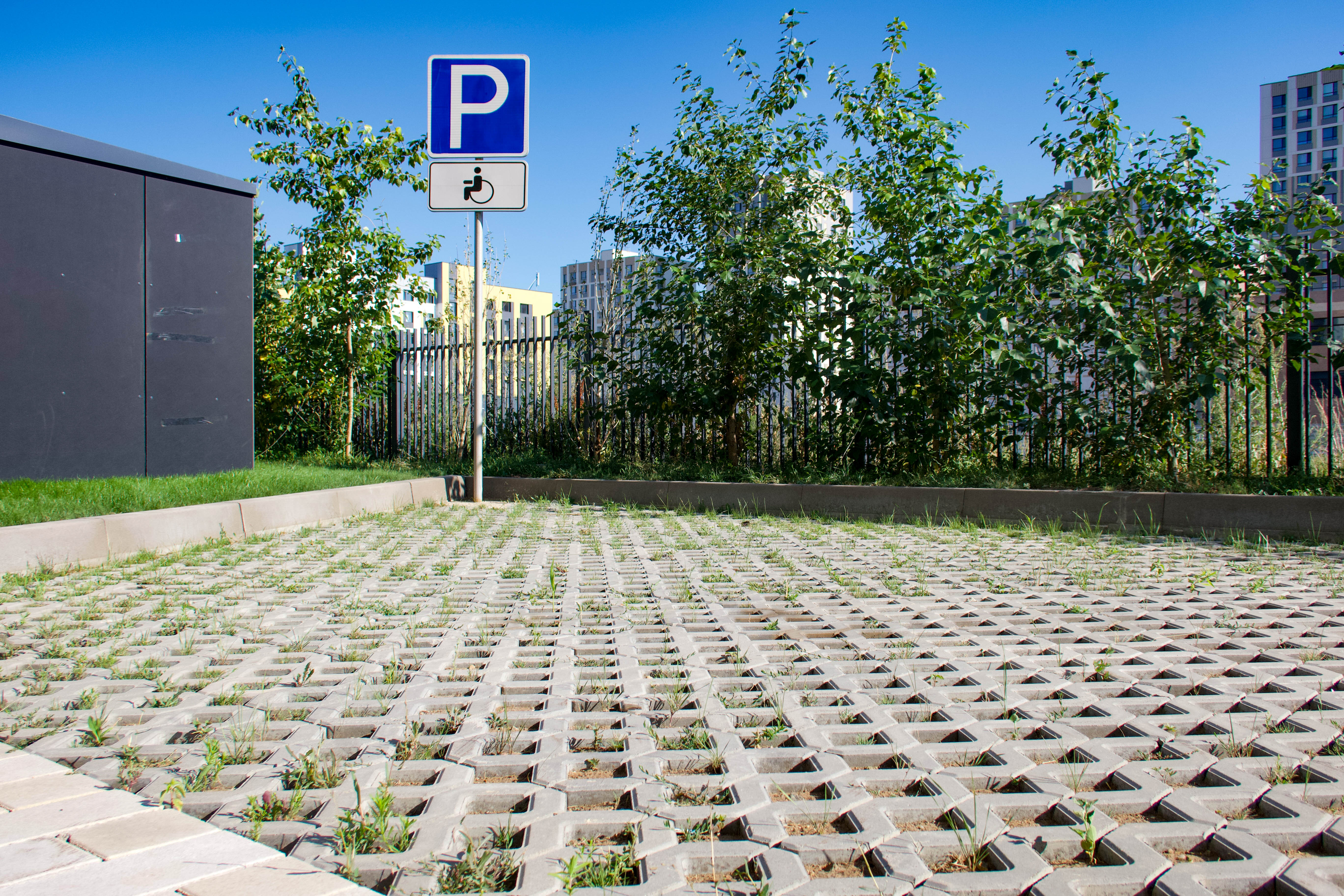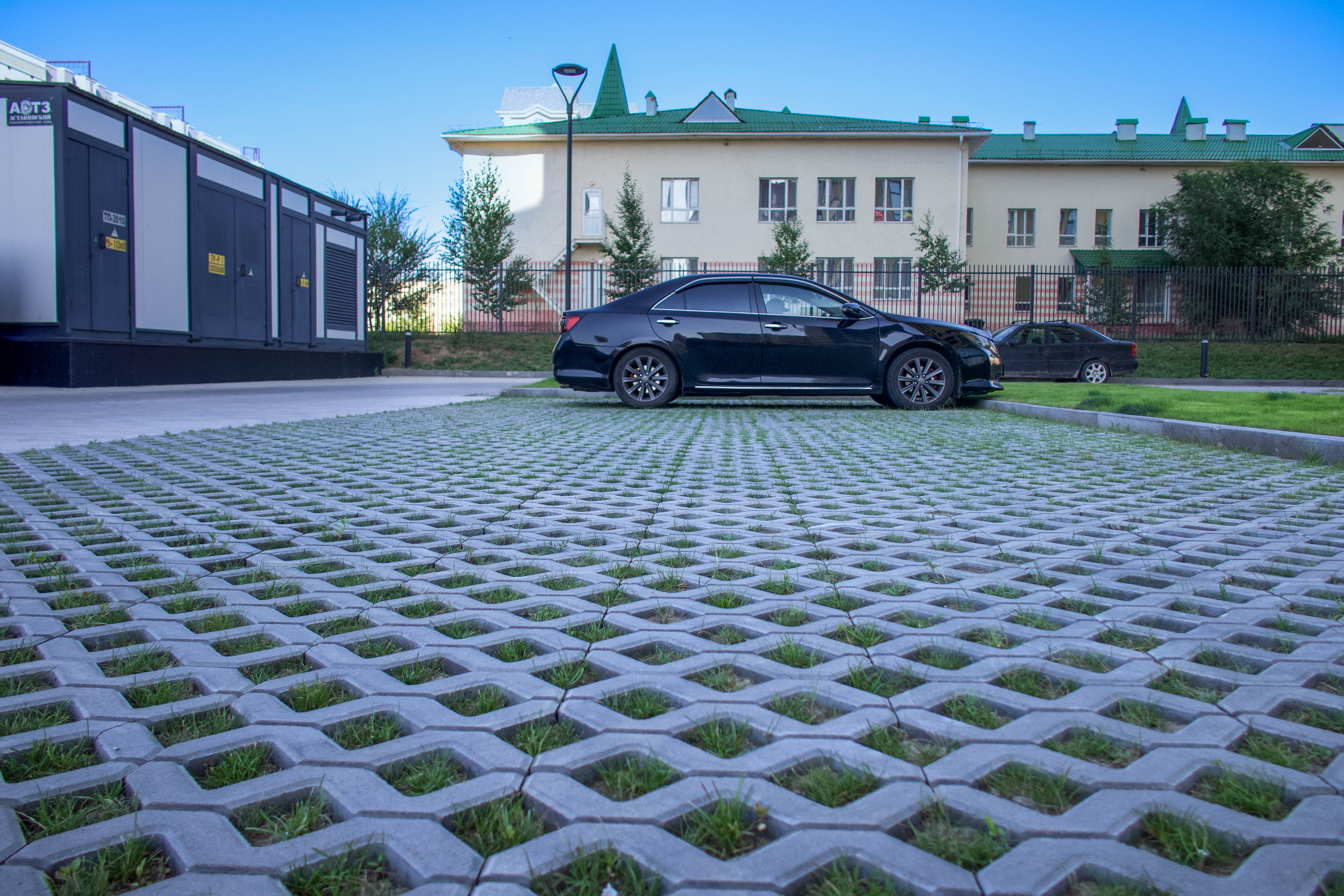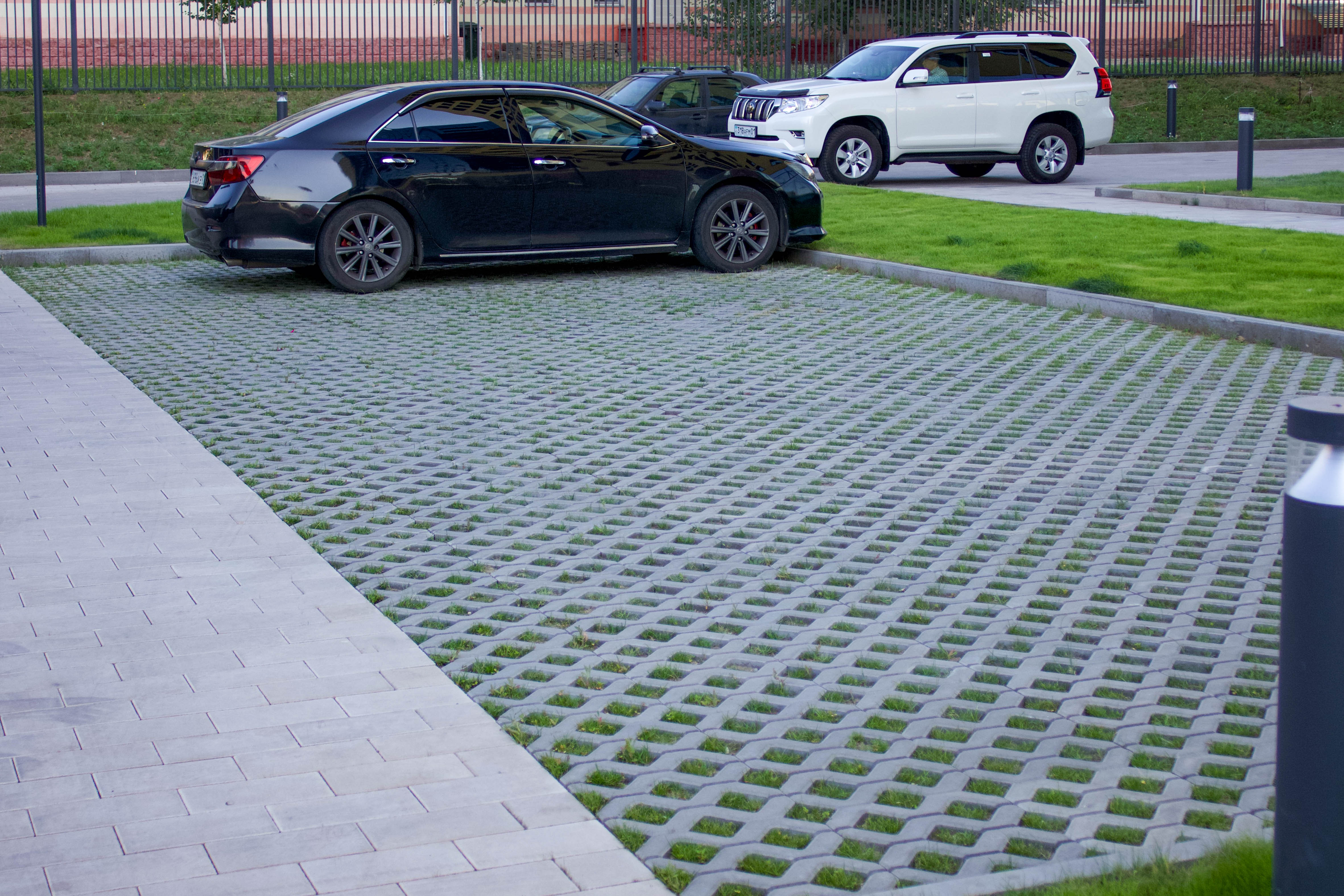 Наземные парковочные зоны оформлены с использованием бетонных решёток «Меба» — экологичного и практичного решения, способствующего естественному дренажу воды и озеленению территории.