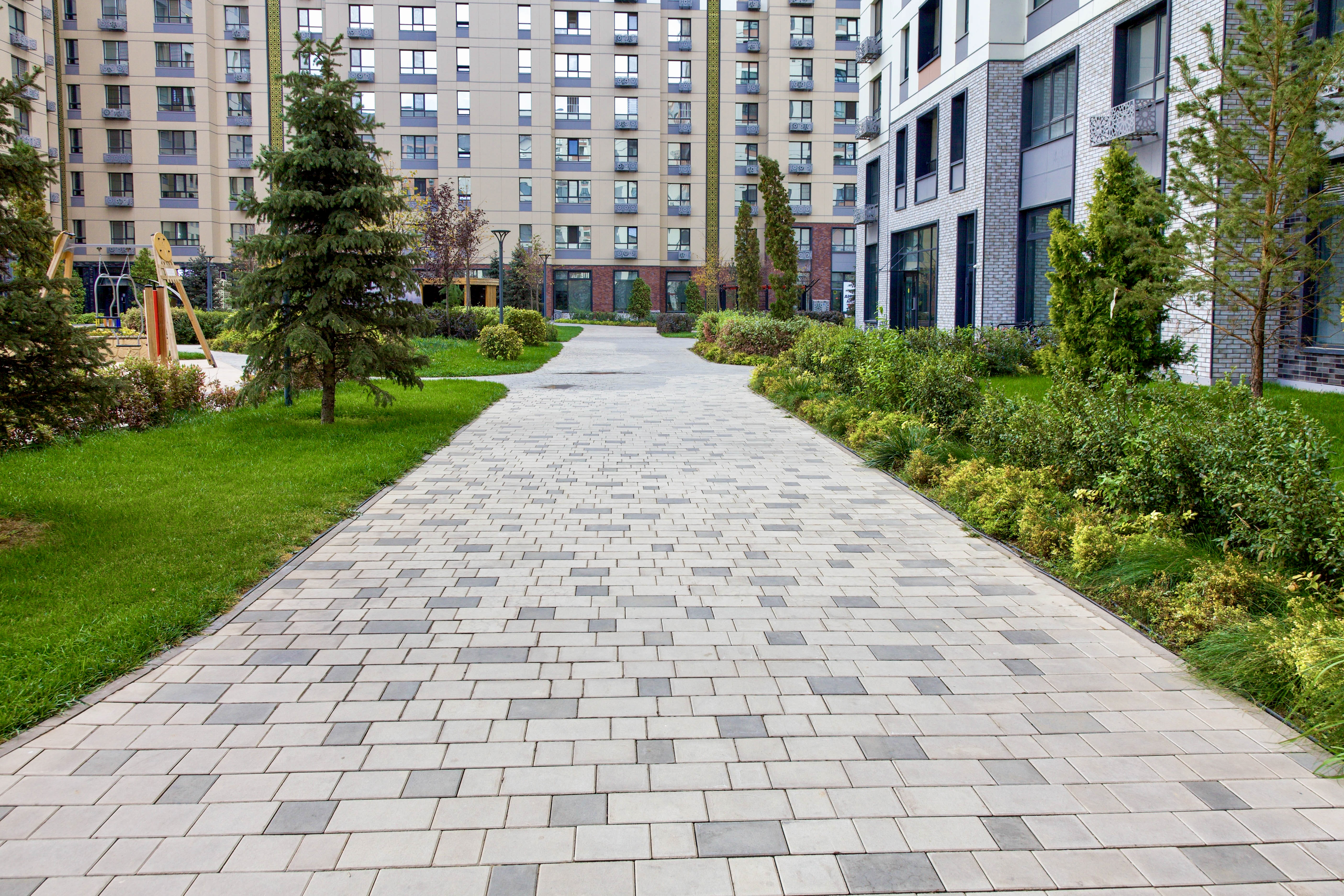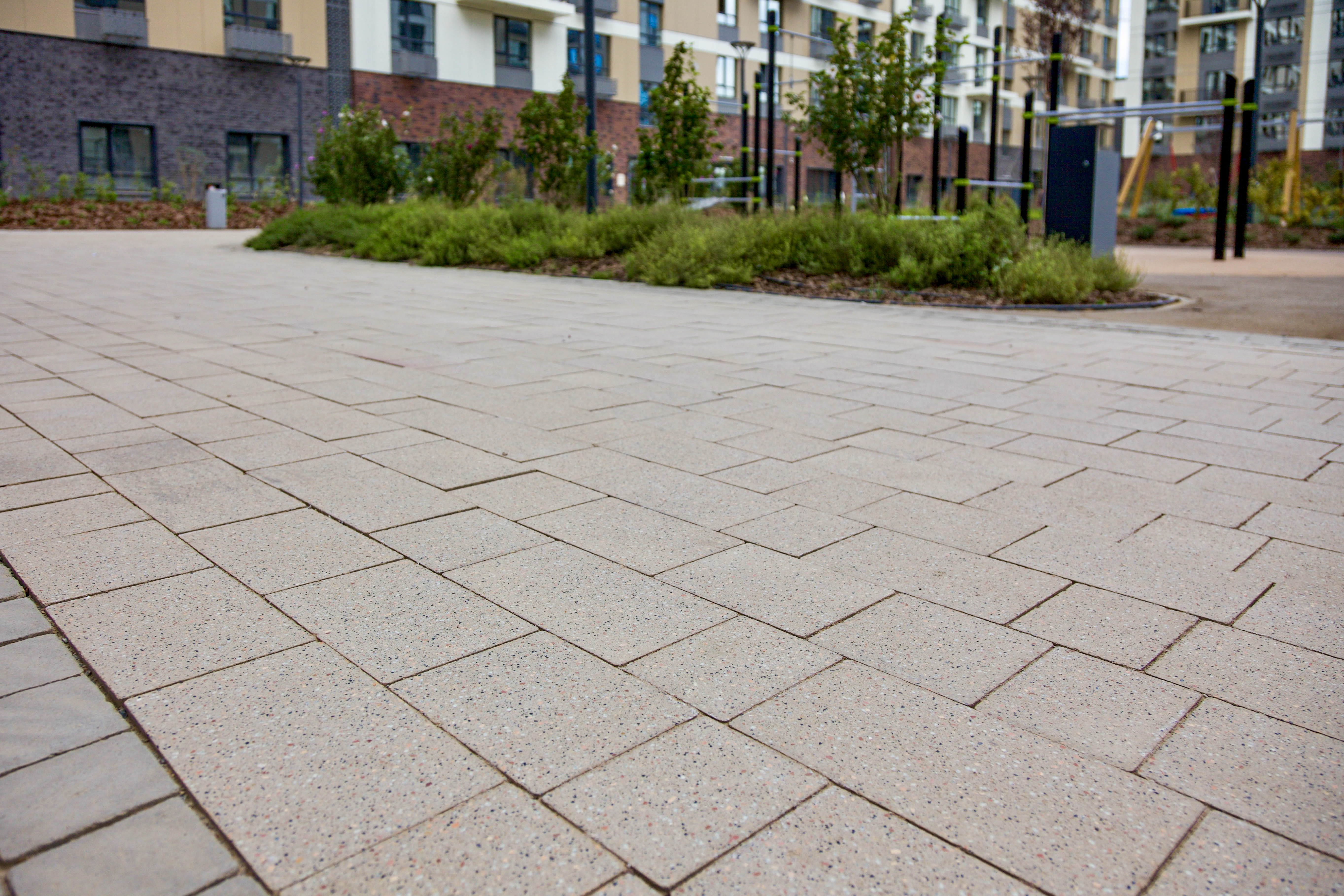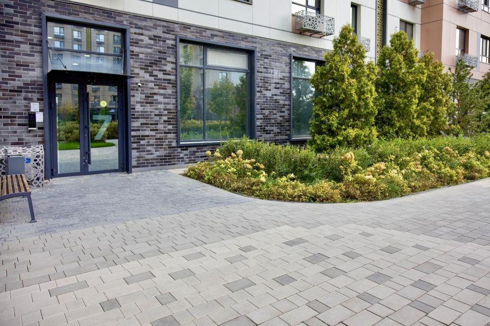 Две очереди жилого комплекса объединены единым подходом к благоустройству: территория вымощена мультиформатом Микс S.
