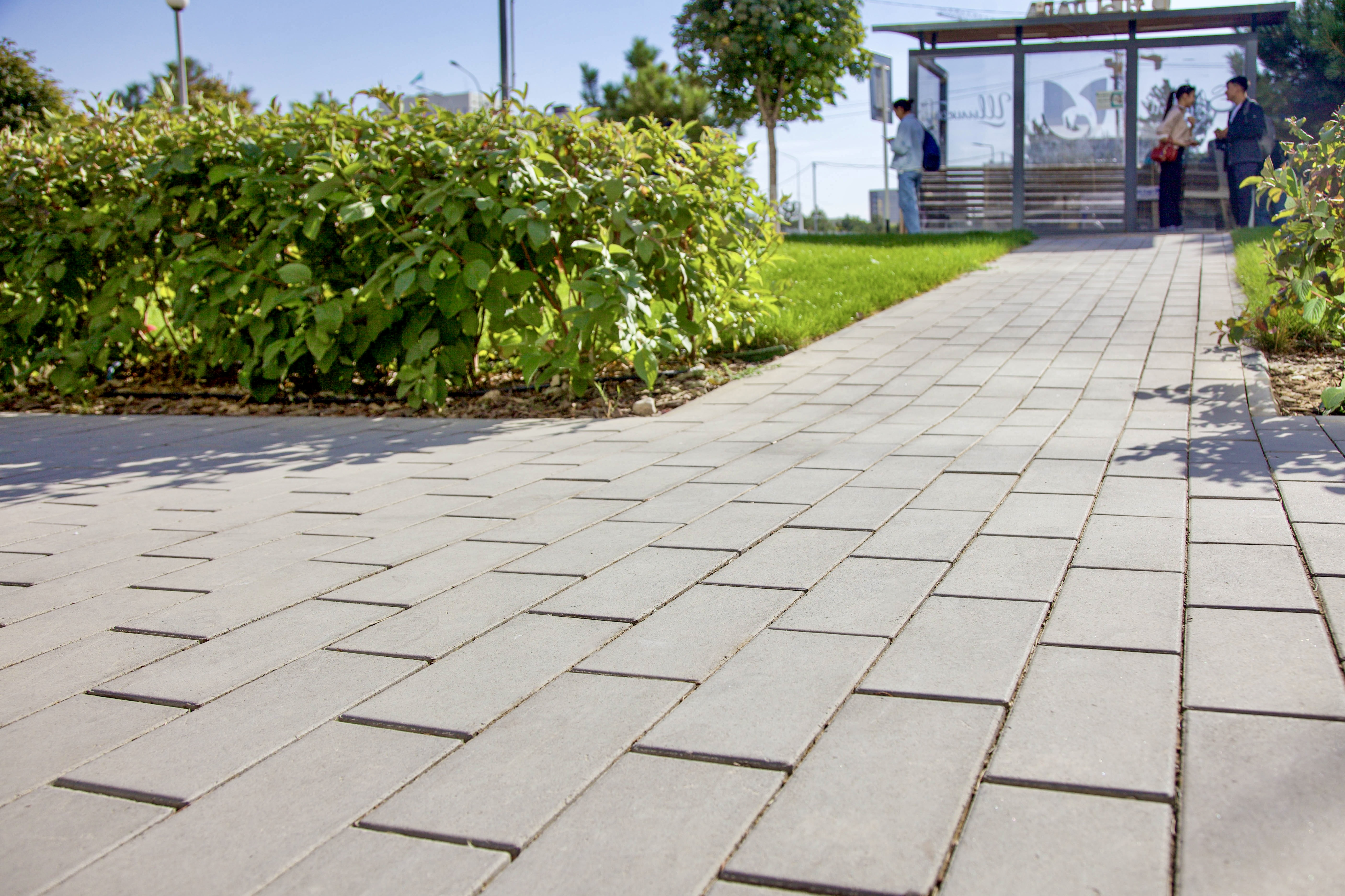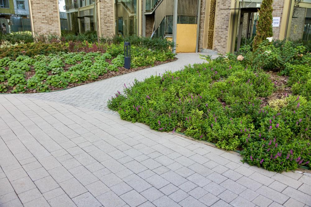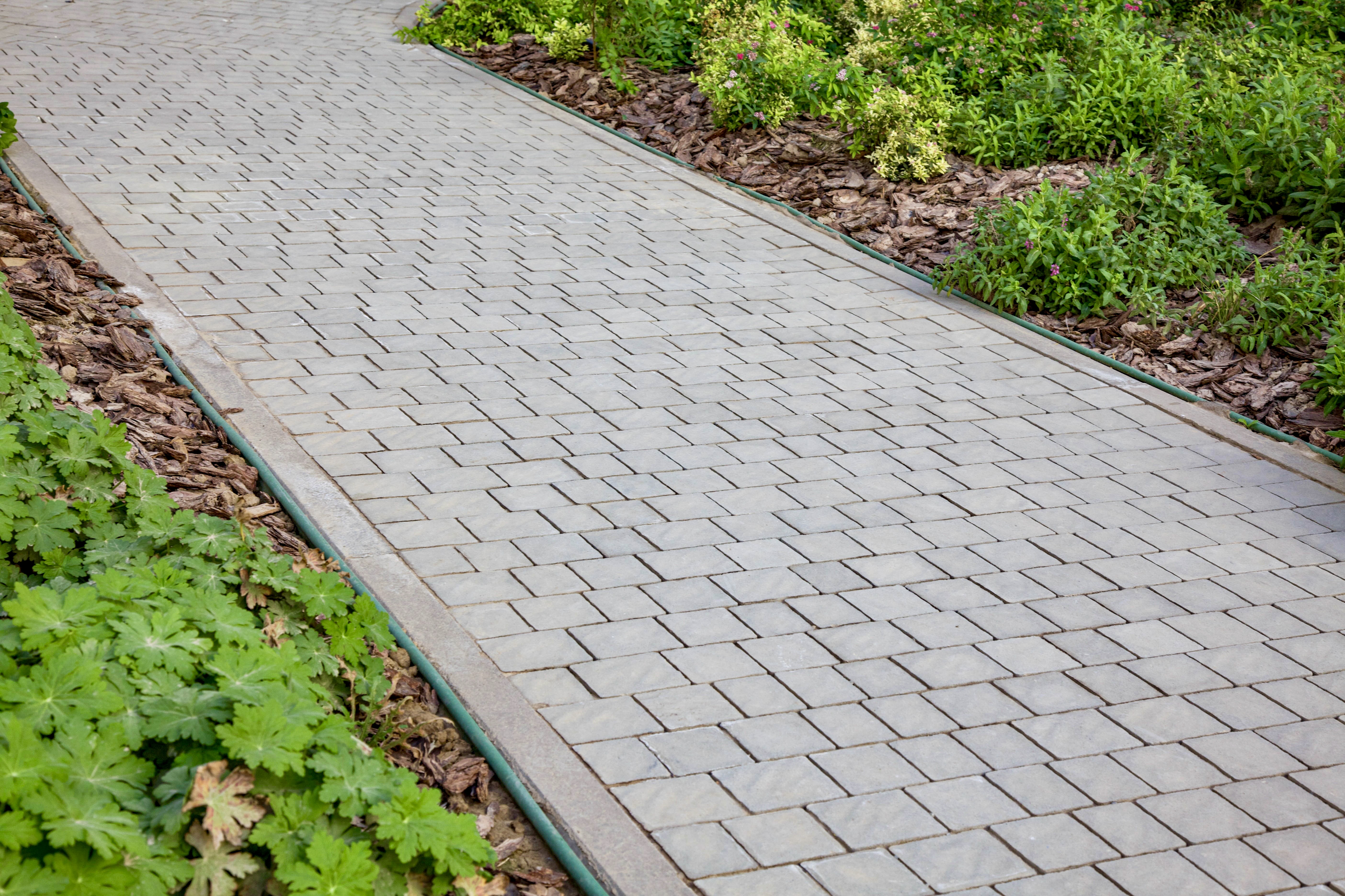 Акцентные зоны оформлены каменно-серыми камнями Софи, а внешний двор — форматами 30х15 и 20х10 в том же цвете.