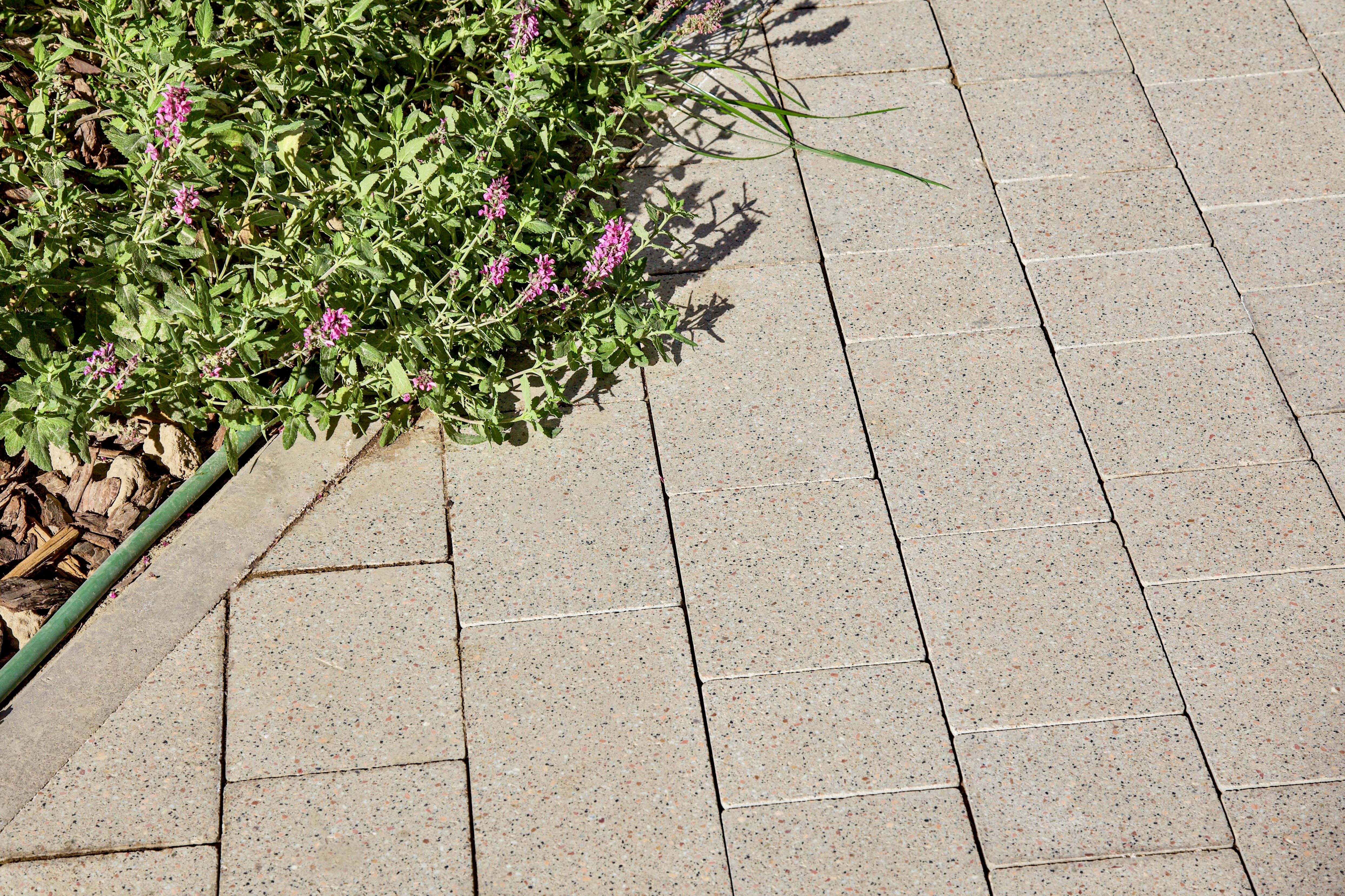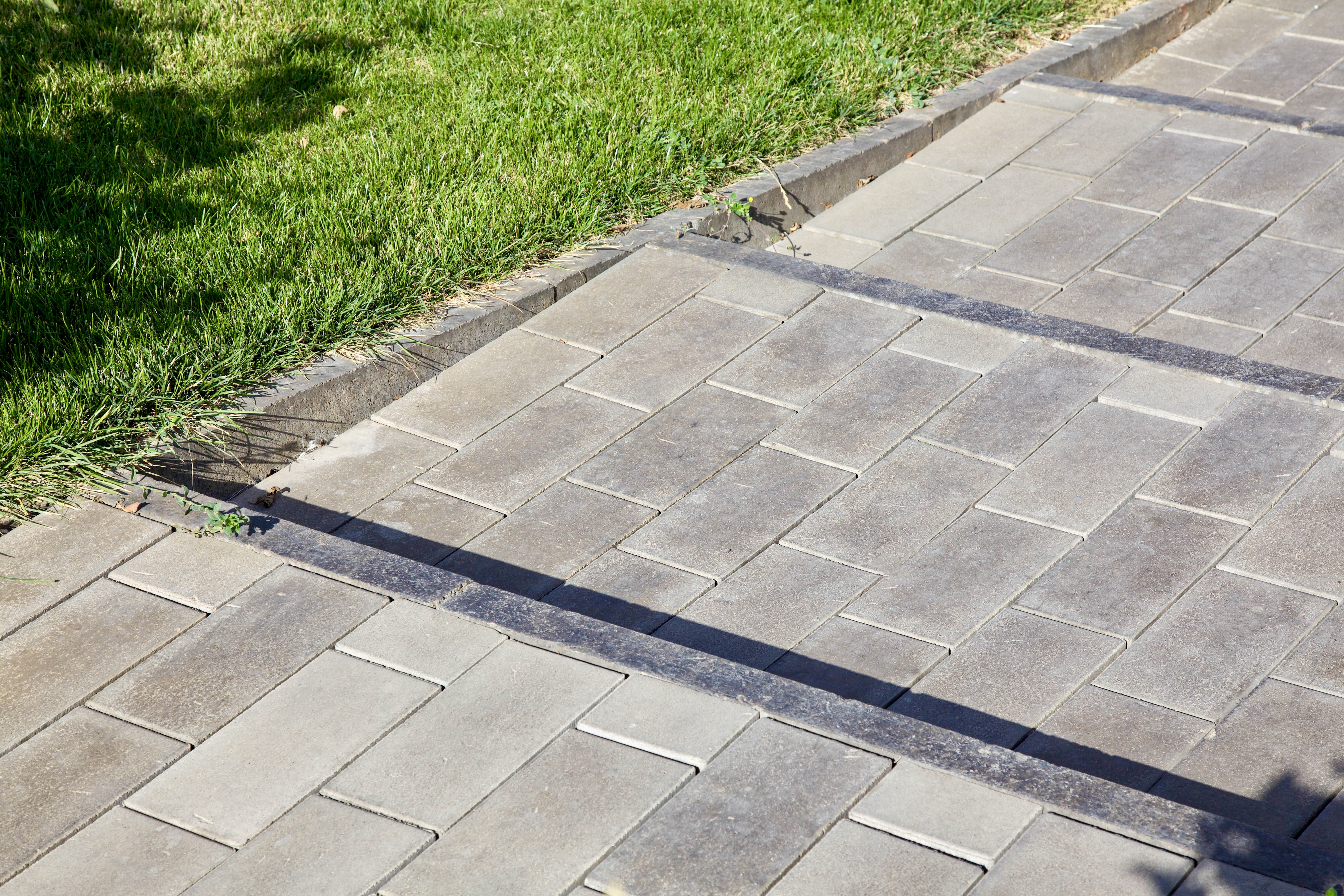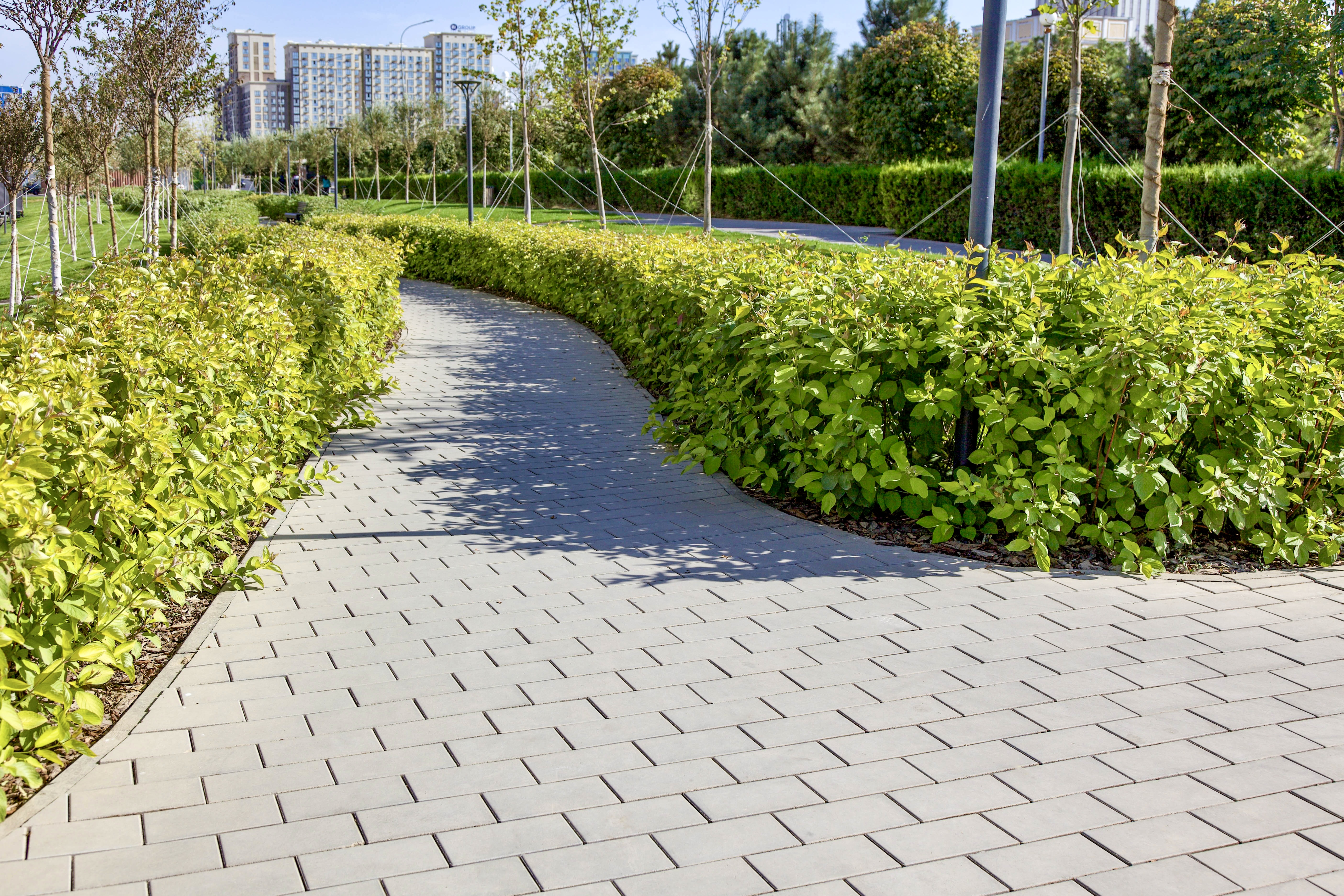 Акцентные зоны оформлены каменно-серыми камнями Софи, а внешний двор — форматами 30х15 и 20х10 в том же цвете.