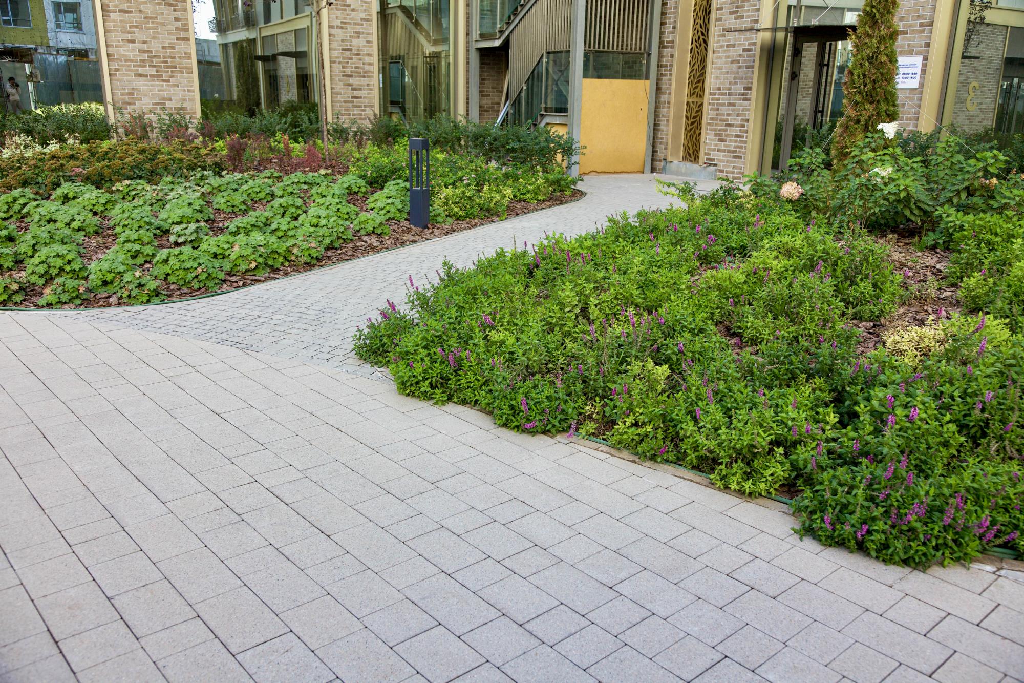 Внутренний двор выполнен в премиальной фактуре Granite Silk с использованием мультиформатных камней Микс S — такое решение подчеркивает архитектурную геометрию пространства и делает его визуально объемнее.